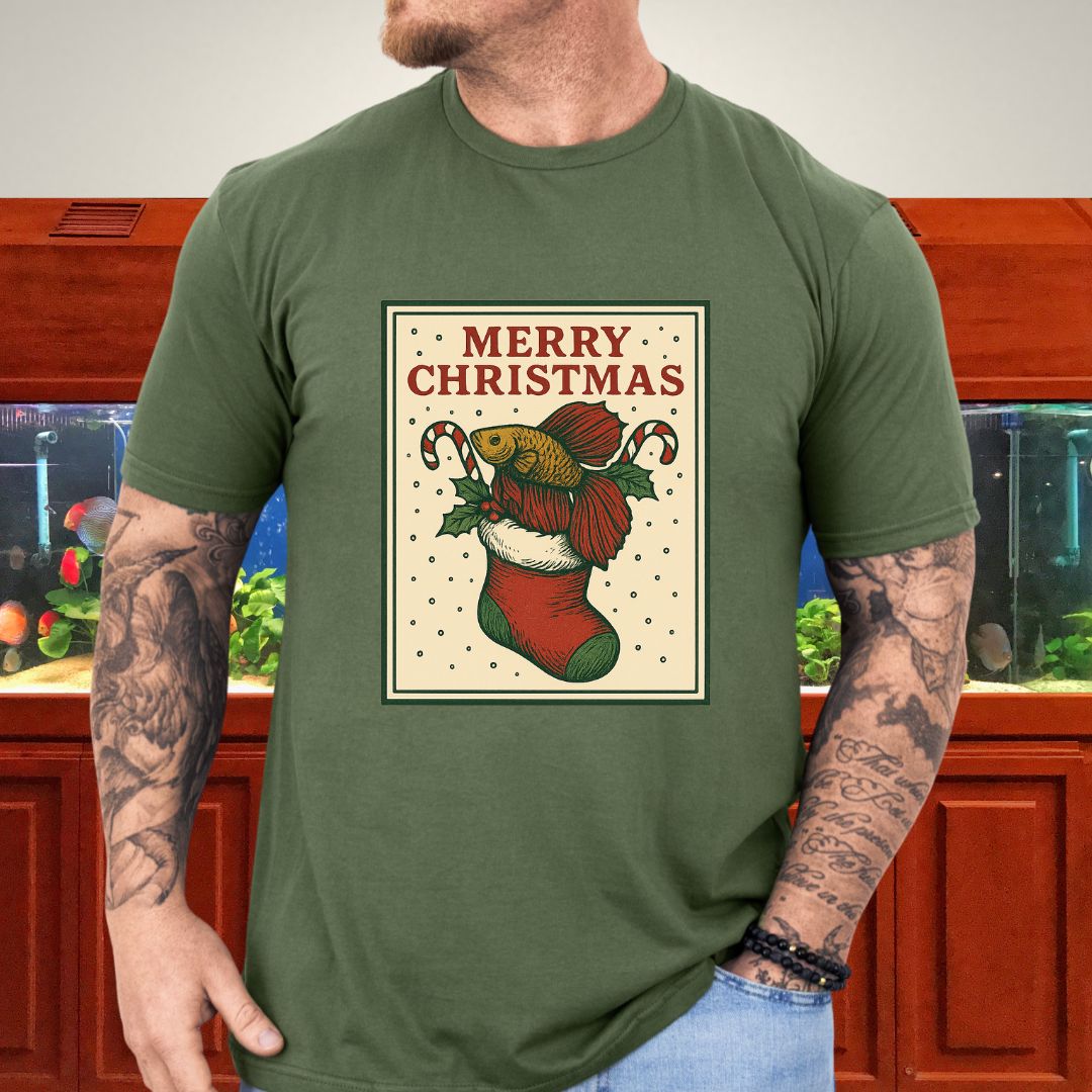 Christmas Stocking Betta Fish Tee – Hand-Sketched Holiday Card Design