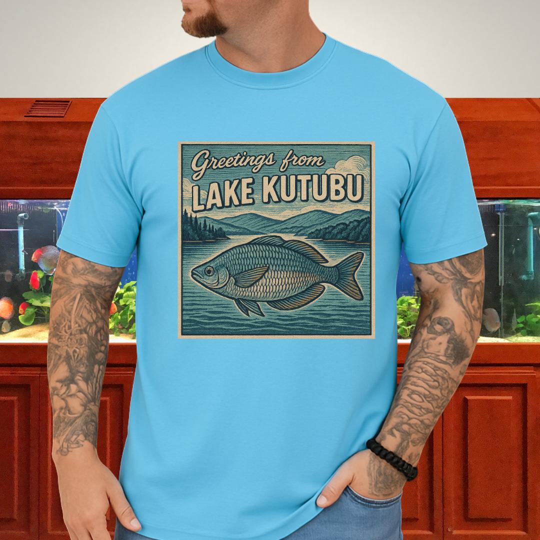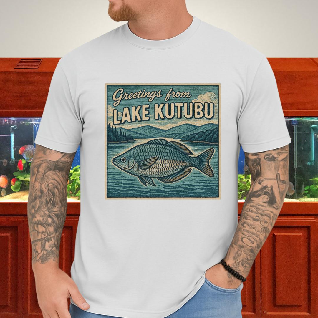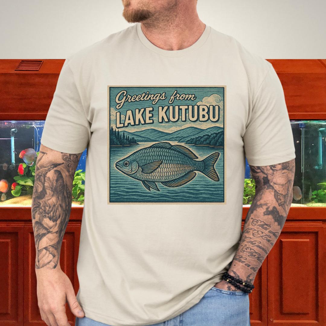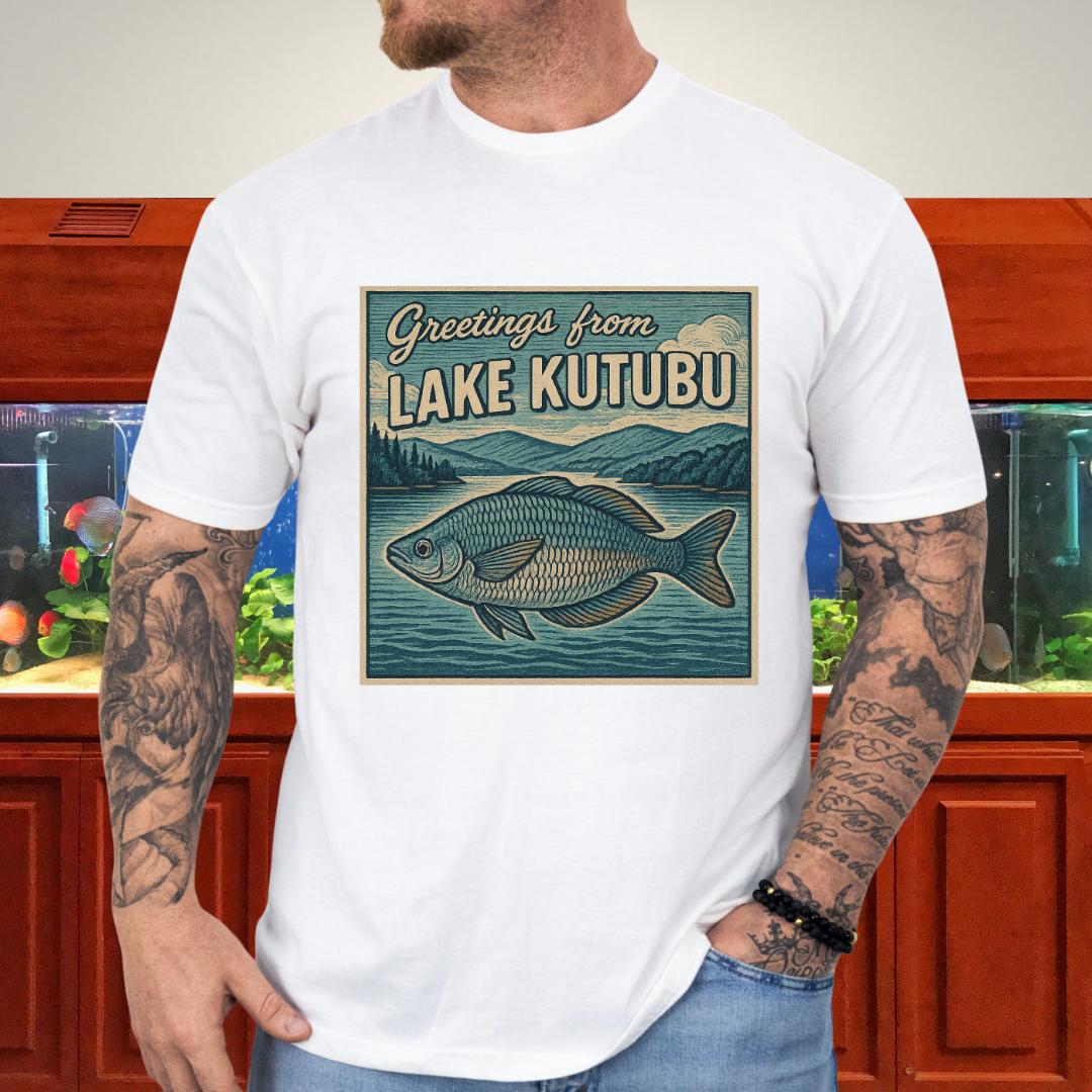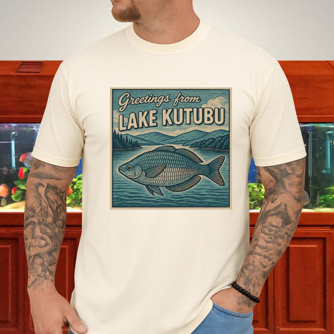 🎨 Design highlight: Woodcut-style Rainbowfish art with retro “Greetings from Lake Kutubu” typography.
