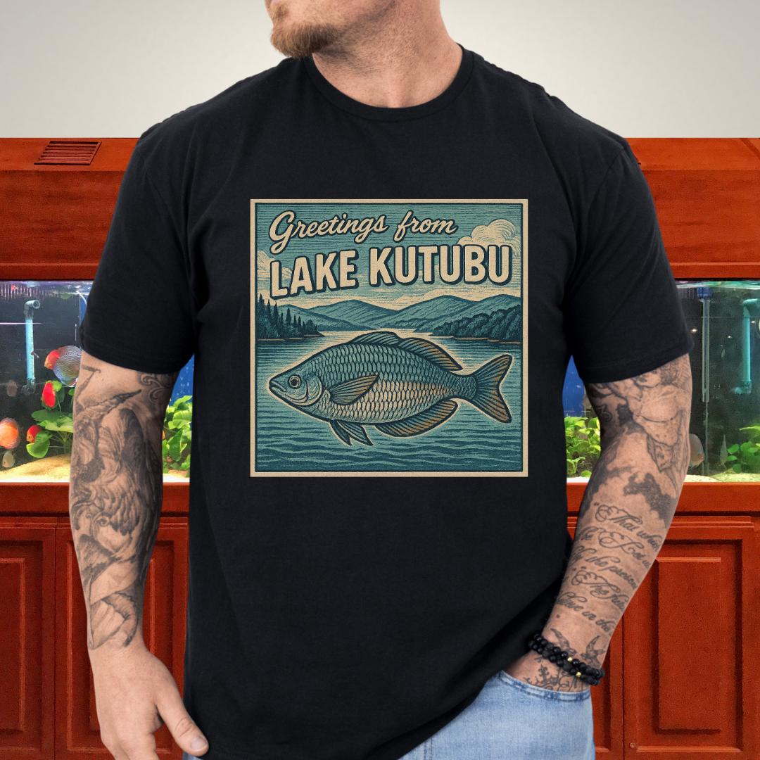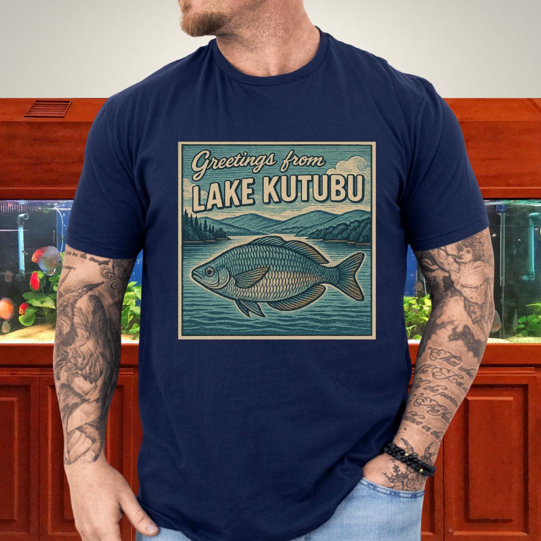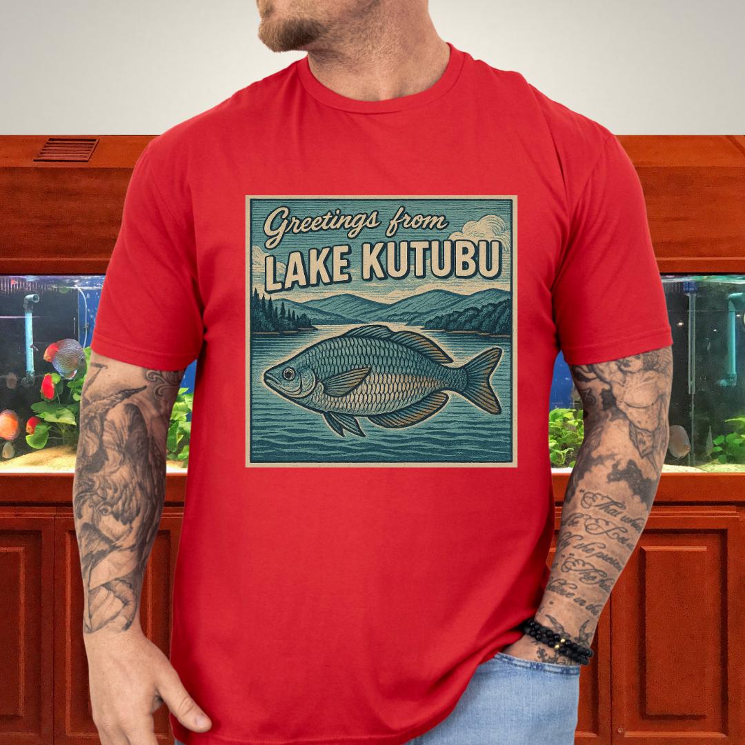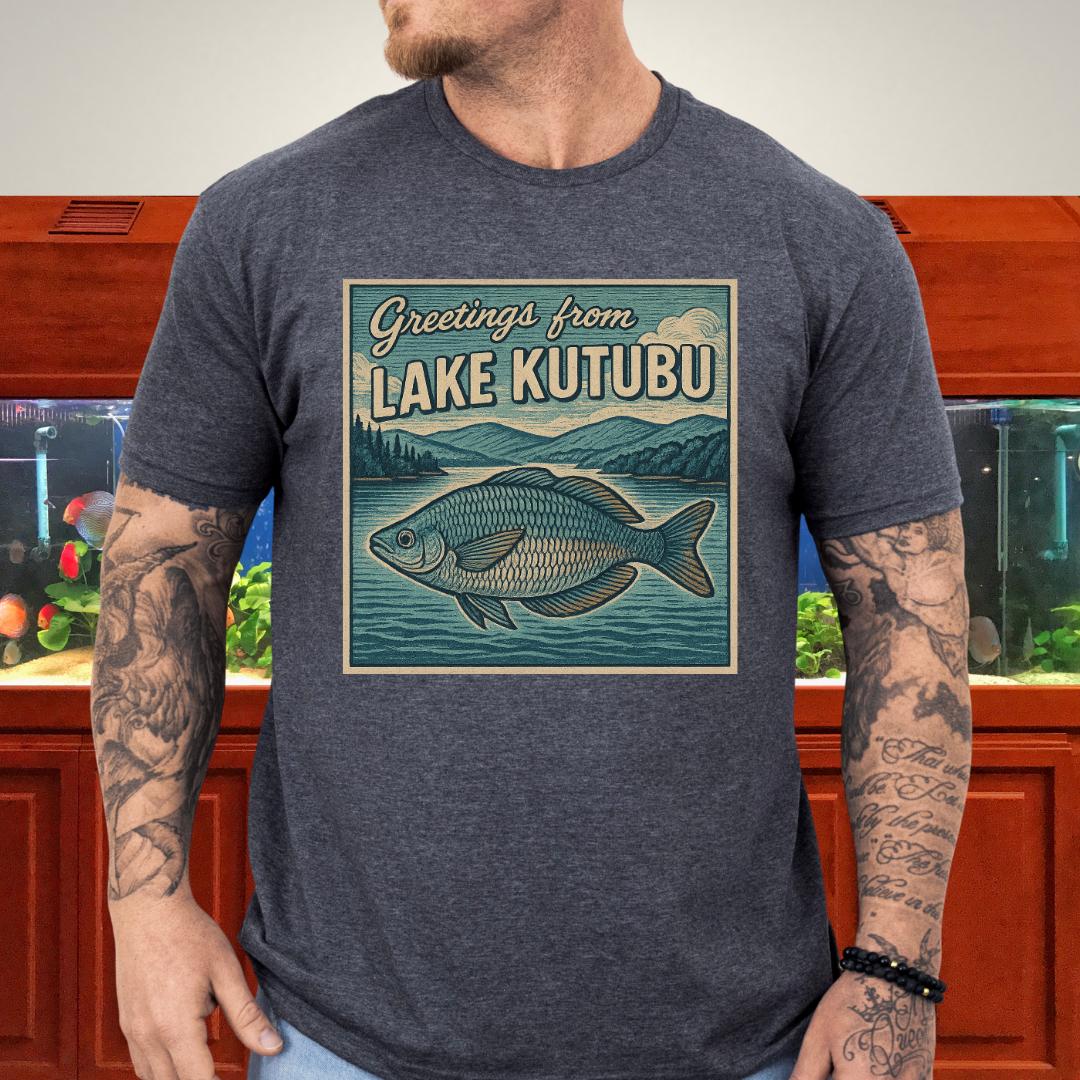 🎨 Design highlight: Woodcut-style Rainbowfish art with retro “Greetings from Lake Kutubu” typography.