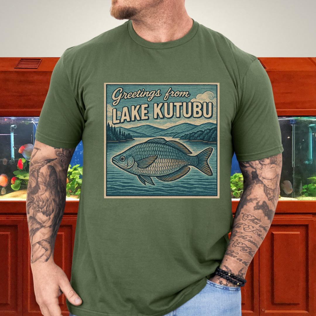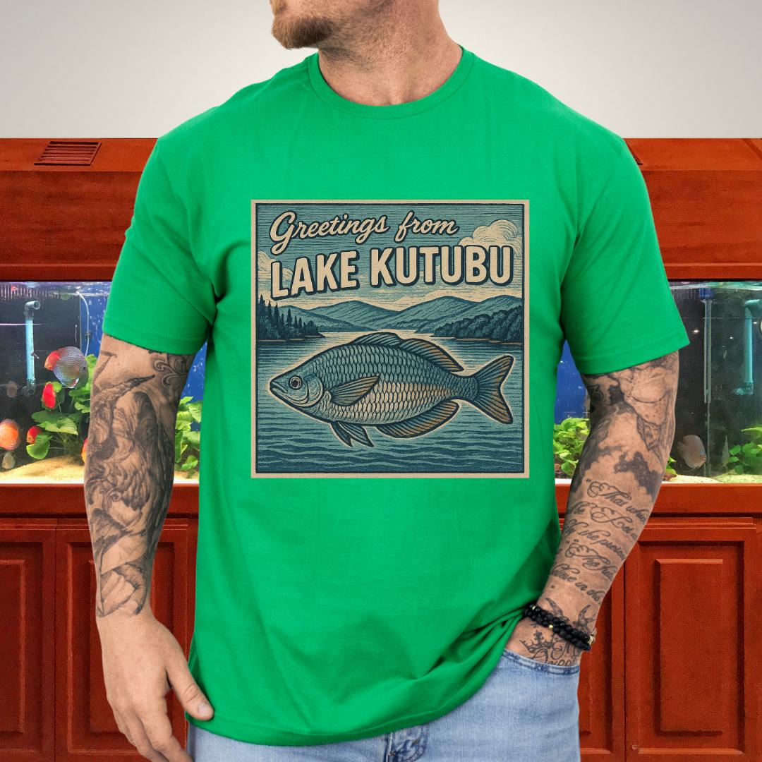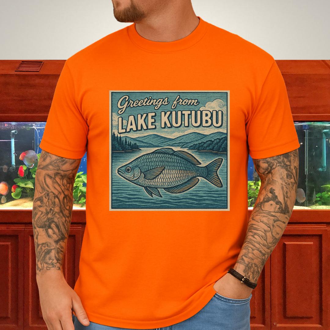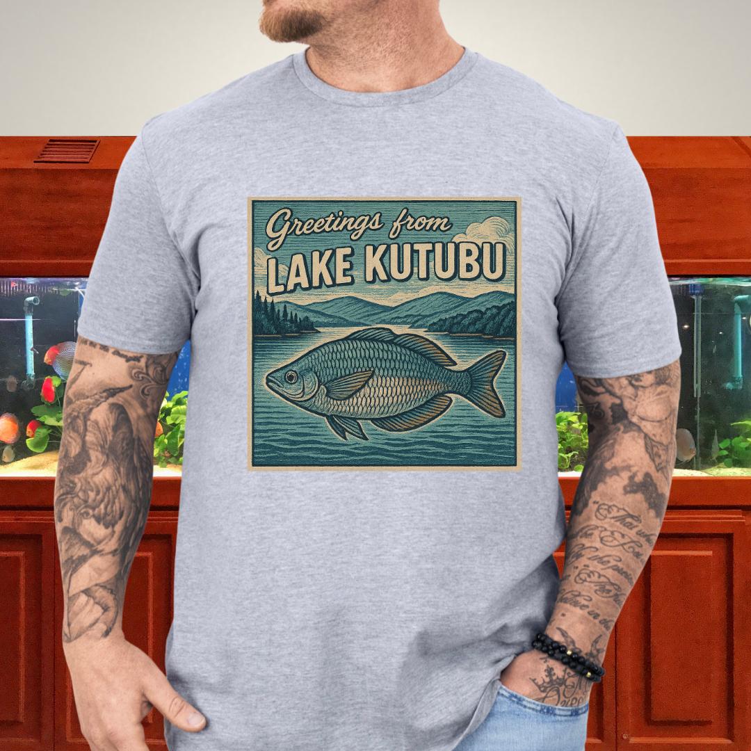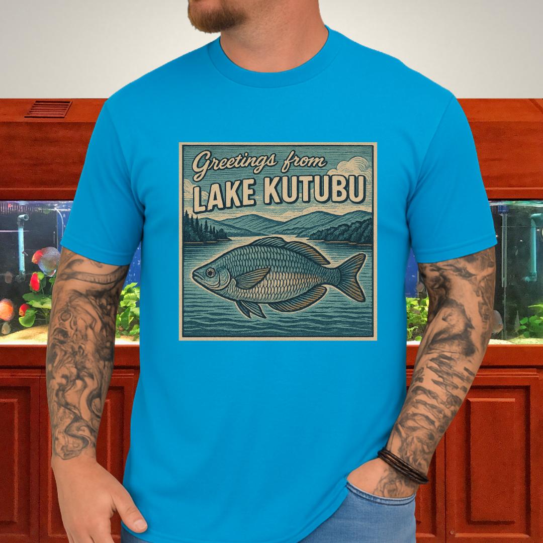 🎨 Design highlight: Woodcut-style Rainbowfish art with retro “Greetings from Lake Kutubu” typography.