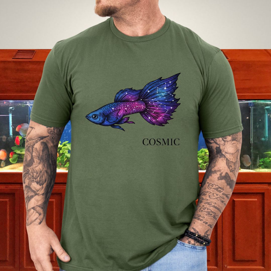 🎨 Design highlight: Realistic guppy morphing into a galaxy tail with constellations and stars.