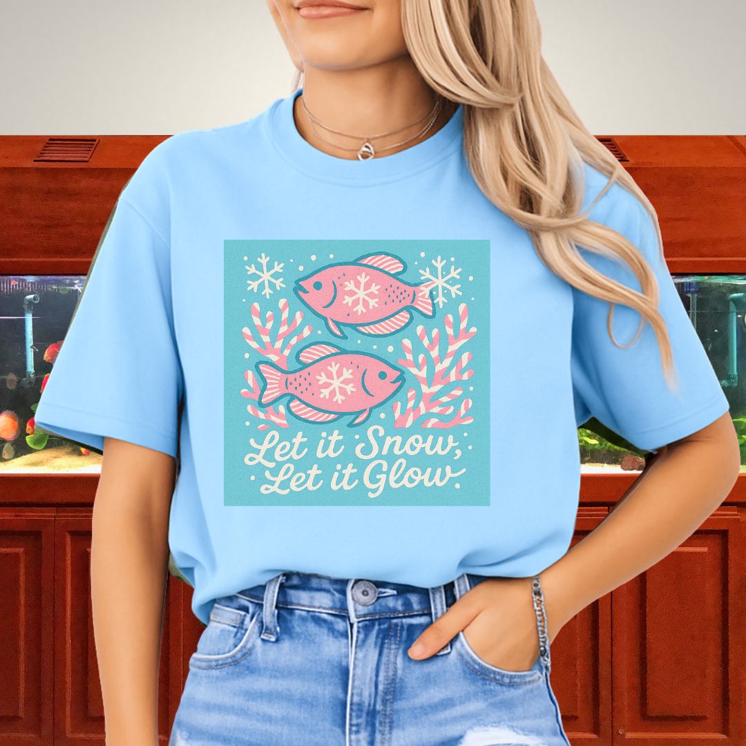 The artwork shines in a pastel holiday palette of blues, pinks, and whites, bringing a soft yet joyful glow to your festive wardrobe. Finished with playful script typography that reads “Let it Snow, Let it Glow,” this design perfectly blends aquarium beauty with holiday magic.
