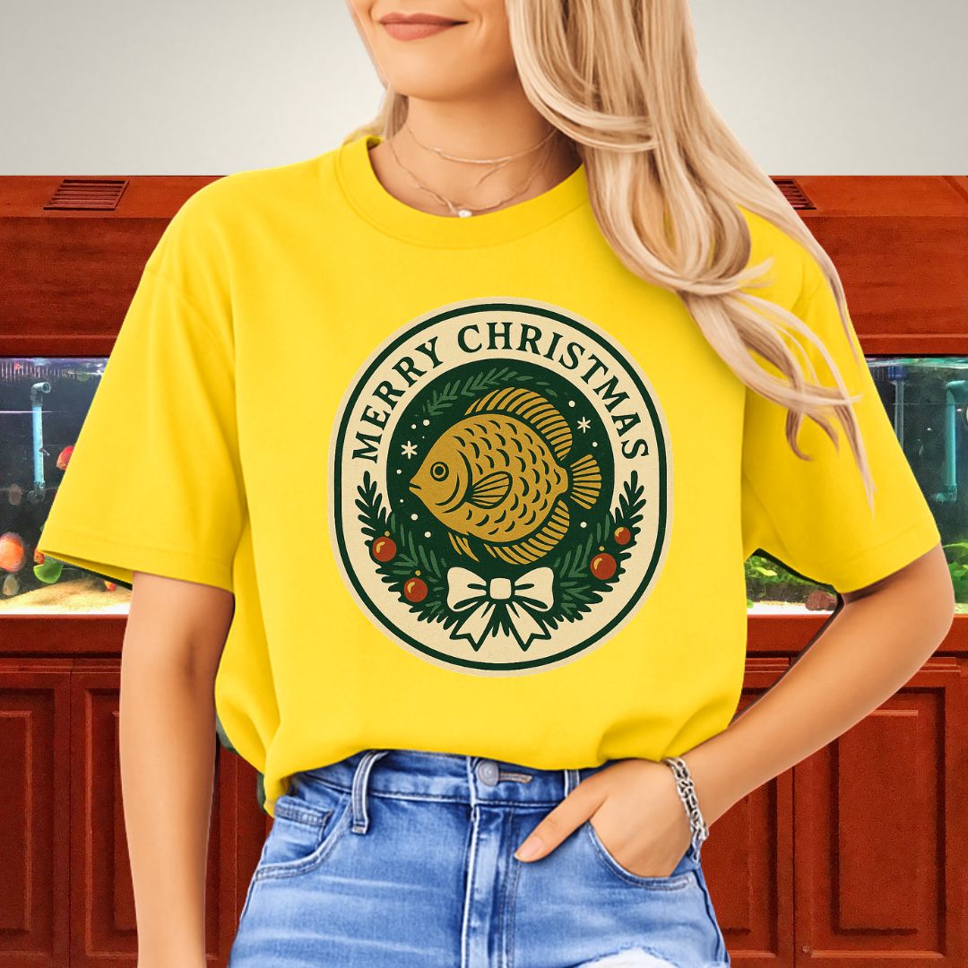 🎨 Design highlight: Golden discus fish inside a decorated Christmas wreath with bow and ornaments.