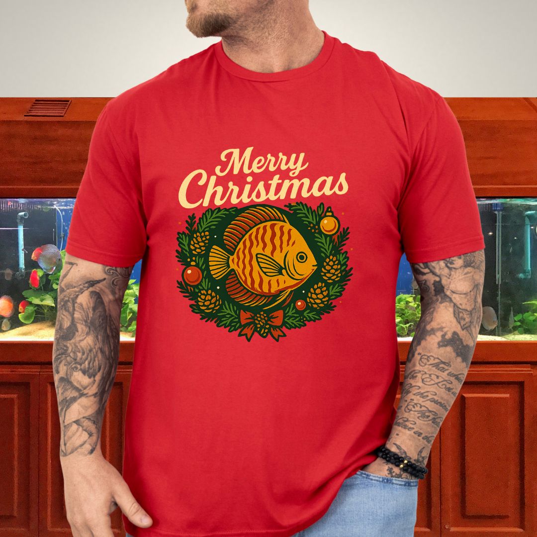🎨 Design highlight: Realistic discus fish framed in a holiday wreath with ornaments and pinecones.