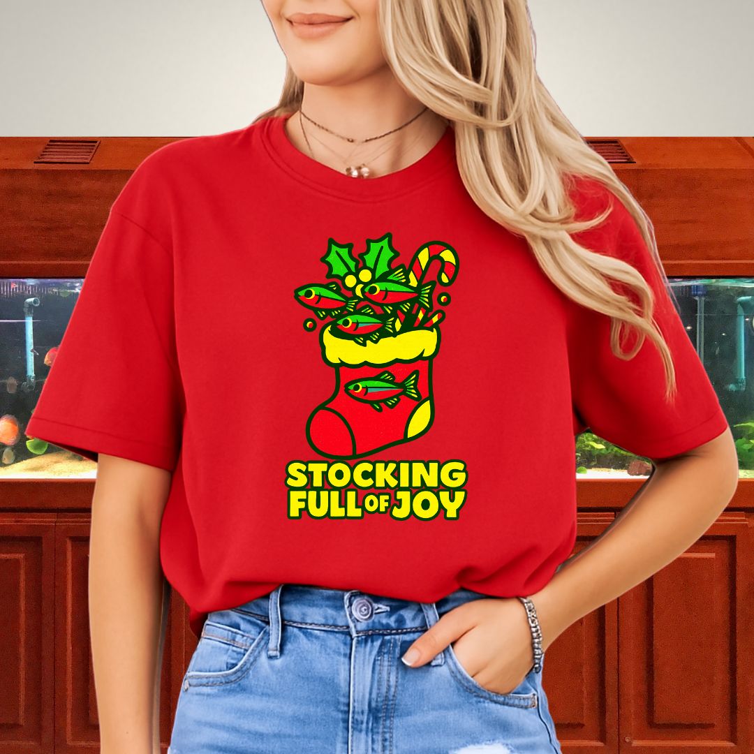 Celebrate Christmas with aquarium joy; the Stocking Full of Joy Tee is a must-have holiday shirt for fishkeepers who love cheerful, kawaii-inspired designs.